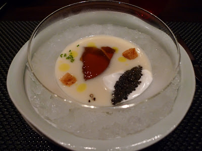 的海膽凍淋白醬汁再等距點上綠菜汁的經典菜色, 至少要維持一些特